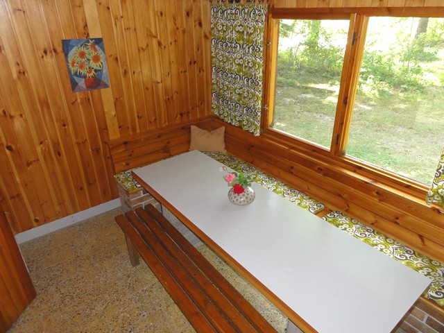 Kitchen unit with 2 cooking plates, cooker PB, fridge, coffee table, pot, wood stove, dining table