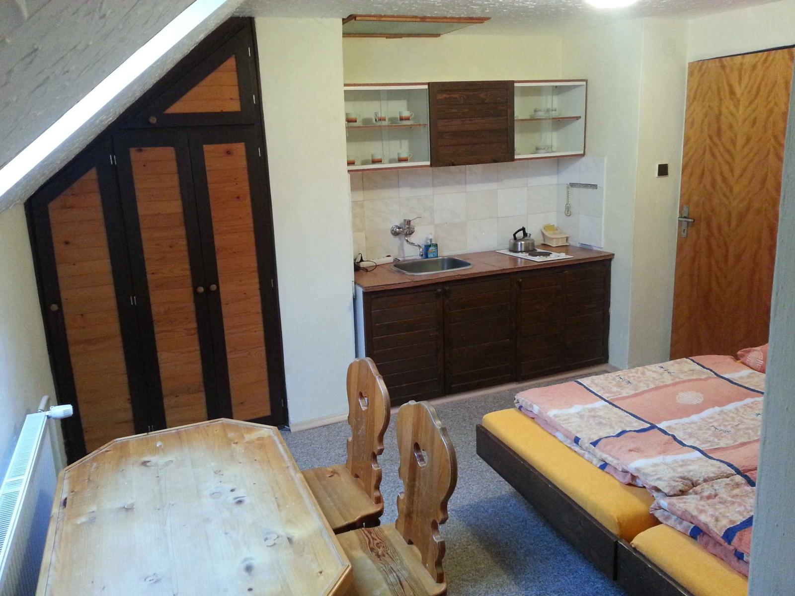 3rd bedroom: small kitchen unit, 2 range stove (without oven), refrigerator, table + chairs, 1x double bed